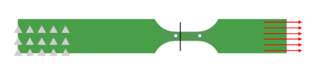 為驗證試驗數據和擬合獲取的真實應力-塑性應變曲線的有效性,通過LS-DYNA軟件對試驗材料進行了有限元模擬仿真分析??紤]到材料模型對網格尺寸的敏感性,采用實體單元對試樣進行網格劃分,有限元模擬試件尺寸與實際試件相同(參見下圖)。參照試驗條件,試件左端固支,右端采用*BOUNDARY_PRESCRIBED_MOTION對試件加載(輸入速度-時間曲線)。通過在測量段設置橫截面*DATABASE_CROSS_SECTION_PLANE定義拉伸載荷輸出(下圖中黑實線),同時在測量段兩端選取兩個節點(下圖測量段兩端的白色圓點),定義*DATABASE_HISTORY_NODE,通過計算這兩個點的相對位移獲得拉伸位移量,并將仿真獲得的載荷對位移曲線和試驗進行比對完成對標。